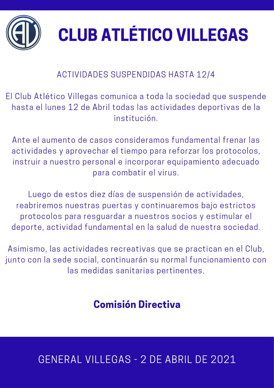 El club Atlético Villegas suspendió todas las actividades ante el crecimiento de casos de Covid