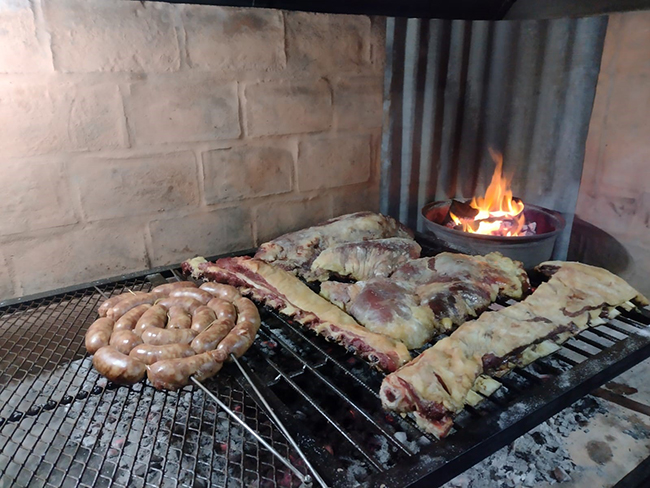Con las camisetas del club de sus amores y la bandera tradicional con la que se identifican de fondo, los concurrentes disfrutan del encuentro, asado de por medio.