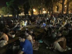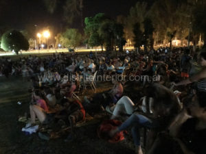 La proyección del film nacional Mamá se fue de viaje está siendo vista por una multitud que colmó uno de los sectores que se encuentran junto a la confitería del Parque.