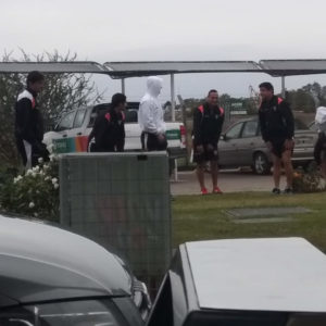 Esta tarde un lector de Distrito Interior captó el momento en que los integrantes del equipo chaqueño estando de paso, estiraban en la estación de servicio YPF ubicada en el cruce de las rutas 33 y 188.