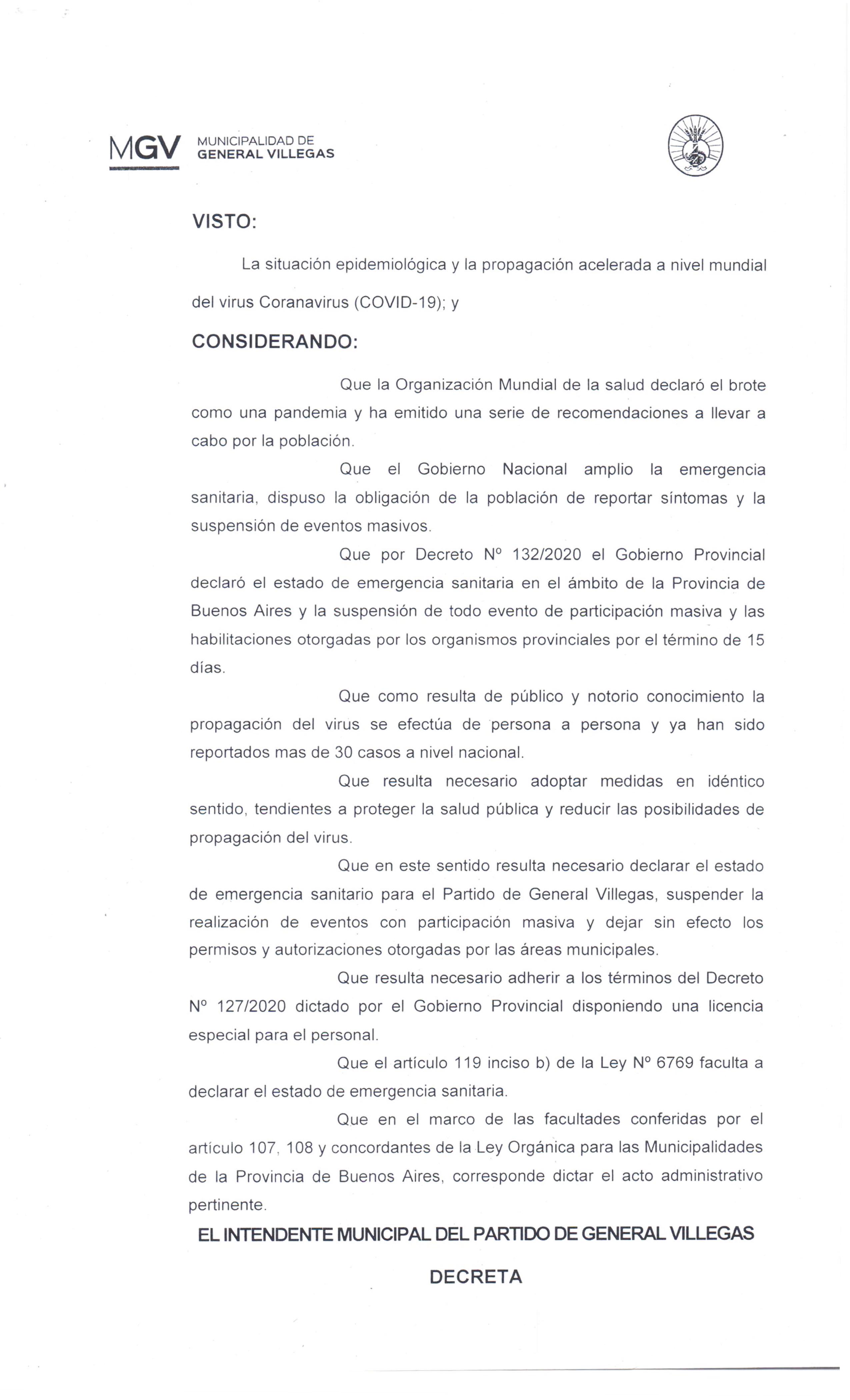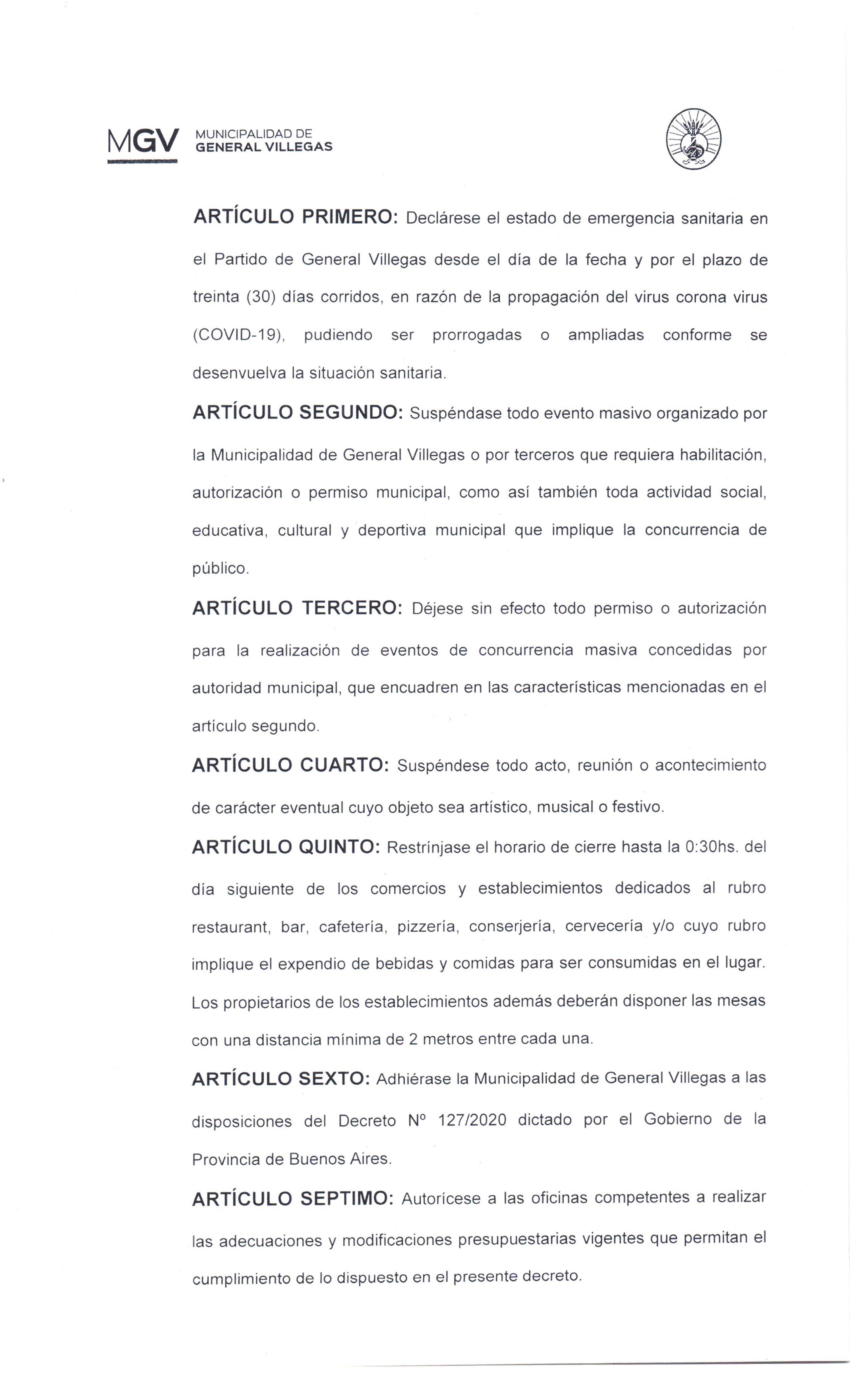 Se declaró el Estado de Emergencia Sanitaria en el partido de General Villegas por Distrito Interior · 13 marzo, 2020 Relacionado Share