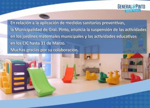 En consonancia con las medidas dispuestas por el Estado Nacional y Provincial, el Municipio dispuso suspender las actividades en los Jardines Maternales y las actividades educativas en los dos CIC desde el 16 hasta el 31 de marzo.