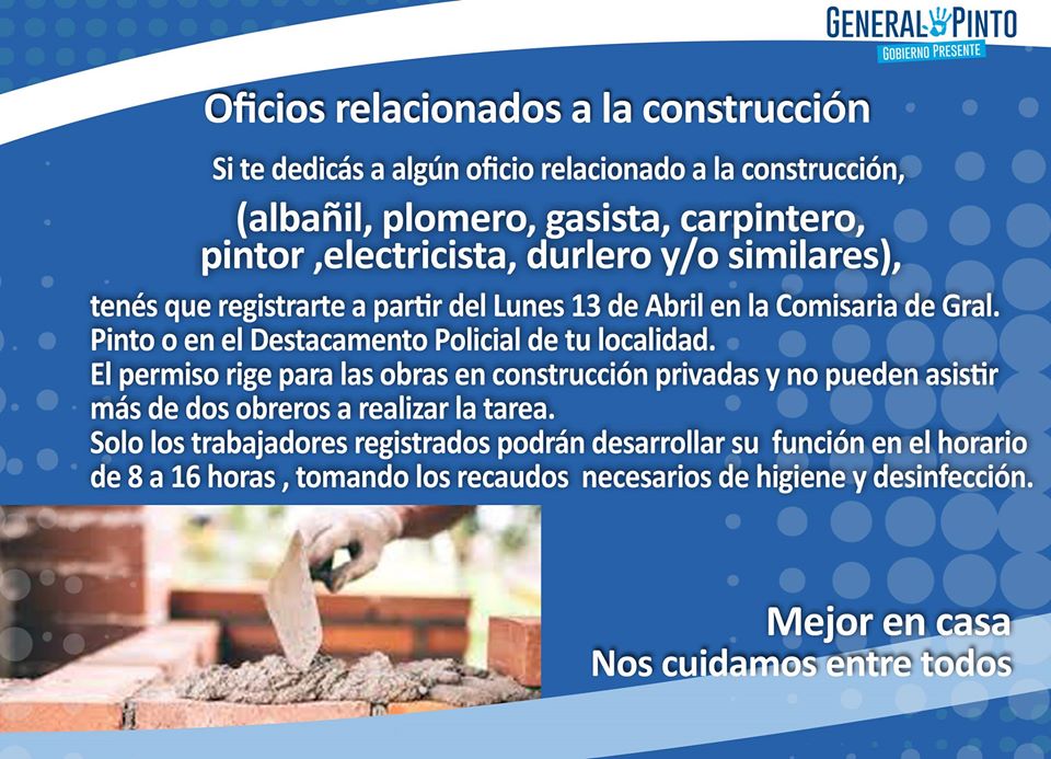 Sin dudas junto a la venta de ropa, el de los oficios mencionados en el comunicado son de los que mayor número de personas nuclea, luego de los estatales (docentes, auxiliares, etc), por ello ni bien el presidente anunció la posibilidad que tenían algunos intendentes de administrar decisiones de acuerdo a las realidades que sus distritos estuvieran viviendo, sobre todo aquellos libres de circulación del Covid-19, en General Pinto se trabaja de acuerdo a la DA 450/2020 emitida por la Jefatura de Gabinete de Ministros, en el que se amplía el listado de rubros y actividades a desarrollarse.