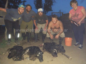 El parto que se dio el jueves al caer el día fue asistido por el veterinario Marcelo Muñoz (el primero desde la der.) quien contó a Distrito Interior, lo inusual del hecho, tanto que la casuística establece que este tipo de nacimiento se da 1 cada 700.000 de manera natural.