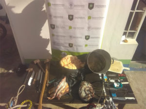 El primero en calle Monte Santiago, casa habitada por Alvarado, arrojando resultado positivo, donde se secuestró una olla, visceras, carne vacuna por un peso de 15 kgs, cuchillos, hacha cabo de madera, martillo tipo masa, chaira, sogas, una motocicleta marca Mondial con motor marca Honda 125 cc, tipo cross, utilizada para cometer el ilícito.