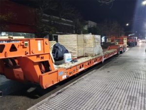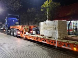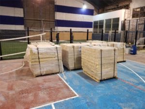 Esta tarde el camión perteneciente a una empresa local arribó al gimnasio «Osvaldo Leiva» con los 512 metros cuadrados procedentes de Misiones.