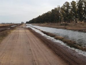 En sentido ruta 33 – Moores apenas se pasa la aceitera se observa la limpieza del canal de desagüe y el retreo un tramo del camino, cuando se avanza, comienza a observarse el agua sobre uno de los laterales que lo inunda y en algunas partes prácticamente ocupa toda la traza, dejándola al borde del corte.