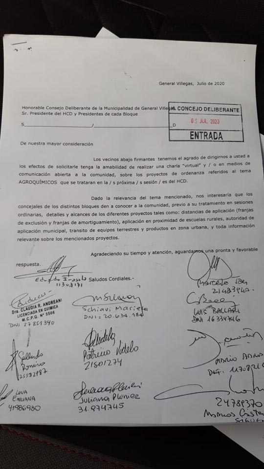 Gral. Villegas: vecinos presentaron nota solicitando ser puestos al tanto sobre las Ordenanzas de agroquímicos