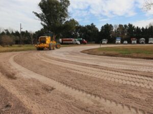 Hoy se ven las motoniveladoras y camiones del Estado Municipal, hidroelevador y personal propio y contratado llevando a cabo diferentes acciones como el emparejamiento del terreno y la colocación de piedra en la playa de camiones, el reemplazo de luminarias y colocación de columnas en diferentes puntos del predio.