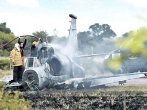 Sin embargo, a unos 50 kilómetros del lugar de origen, el avión de guerra sufrió un desperfecto y terminó estrellándose en un campo en la zona de la localidad cordobesa de Villa Valeria: el piloto logró eyectarse, pero de todos modos falleció.