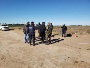 Personal de los CPR de América, Carlos Tejedor, Ameghino y Gral. Pinto, junto a efectivos de la Policía Comunal, DDI y agentes municipales caminaban un perímetro que se extiende hasta donde la calle se termina, uno 3.000 metros del lugar donde el pasado jueves un vecino halló los restos óseos. El camino tal como se lo ve hoy no existió hasta hace un mes aproximadamente en que el municipio construyó la traza a requerimiento de un productor; por otra parte, el campo contiguo a los dos canales en los que se trabaja no es labrado desde hace una década aproximadamente, por lo tanto, no descartando que puede tratarse de un cuerpo presente en algunos de los espacios mencionados que pudo haber desenterrado un animal, es que se recurrió a esta técnica.