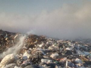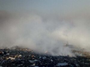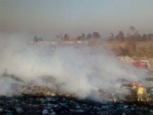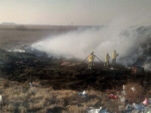 Hasta el momento el fuego que se esparció rápidamente no alcanzó más que basura; extinguirlo está demandando no solamente cinco dotaciones, dos quedaron en el cuartel por si fueran requeridas por otro evento, y sumarán una máquina para remover la superficie y contribuir con tierra para ahogar el fuego.