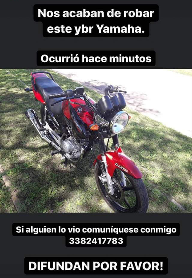 El rodado, una Yamaha YBR color rojo, fue sustraída a la familia Nacarrete – Seitz.