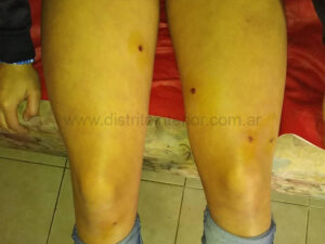 Según relató la mamá seis perdigones provocaron las heridas que muestran las imágenes, debiendo ser atendida en el hospital donde le realizaron un precario con el que se presentó a la comisaría a radicar la denuncia, no habiendo hasta las 13:00 hs. logrado realizarla.