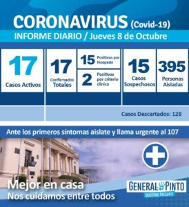 A menos de una semana de la aparición del primer caso, el distrito suma 17 casos activos, 15 por hisopados y los restantes por criterio clínico. De acuerdo al informe de este 8 de octubre.