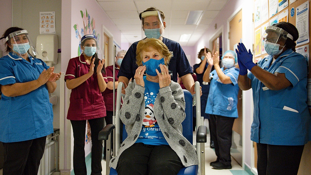 La primera inyección fue recibida por Margaret Keenan, una británica que cumple 91 años la semana próxima, en un hospital de Coventry, en el centro de Inglaterra, en la fase inicial de un vasto programa de vacunación y en el que que ha sido bautizado «Día V».