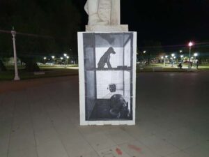 En tres de las cuatro caras que tiene la base fueron colocados grandes imágenes de perros enjaulados.