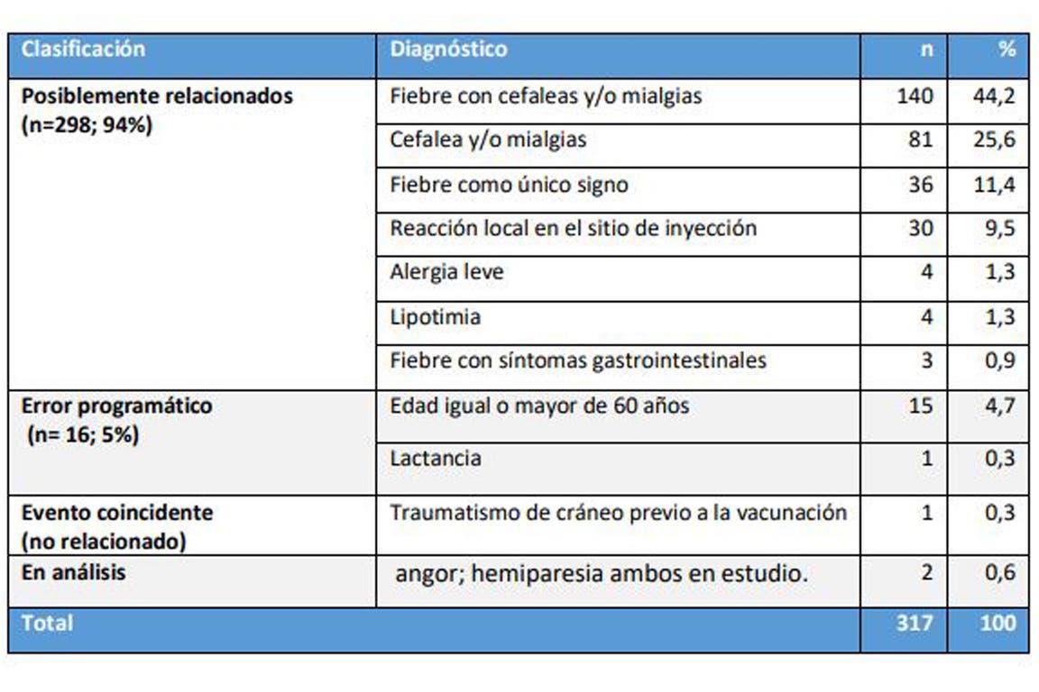 Según el «1° Informe de vigilancia de seguridad en vacunas», fechado el 31 de diciembre, de los 317 Esavi, 298 (el 94%) posiblemente se relacionan a la aplicación de la vacuna.
