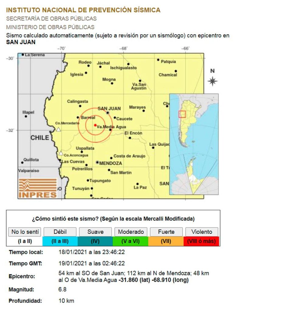 A las 23:46 hs. el Instituto nacional de Previción sísmica midió e informó un sismo de 6.8 en San Juan, a 10 kms de profundidad.