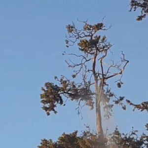 Las personas que se encontraban en el lugar advirtieron fuego en lo alto de un pino que con el correr de los minutos comenzó a desprender hacia el suelo los restos del nido prendido fuego representando un verdadero peligro.