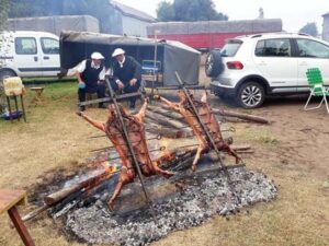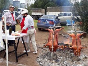 La técnica del asado a la estaca es cocinar la carne sobre una estructura metálica y utilizar el calor de las llamas directamente por lo que no es sencillo lograr el objetivo ya que influye el viento y la intensidad del fuego no debe sobrepasar el punto de cocción para no “arrebatar” la carne y generar una costra que impide luego hacerlo bien. Abel Moreira coordinó las actividades, se asignaron los lechones y se dio tiempo hasta el mediodía mientras que se premiaba no solo la cocción sino también la vestimenta y el stand.