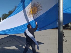 El Intendente Eduardo Campana junto al Presidente del Honorable Concejo Deliberante, Juan José Tomaselli, y la Presidente del Consejo Escolar, Silvia Yglesias, izaron la nueva bandera Nacional que fue bendecida por el Diácono Ignacio Balle en la Plaza Principal Conrado Villegas en el marco del 133° Aniversario de Gral. Villegas este 21 de marzo.