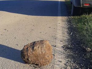 Esta mañana alrededor de las 8:00 hs. Mario Luisetti, vecino de Cañada Seca registró en imágenes una enorme piedra que encontró desprendida del asfalto entre ambas localidades.
