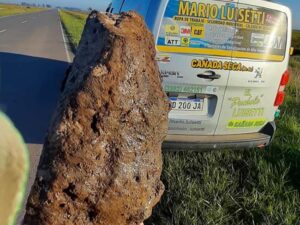 Consultado por Distrito Interior contó que el cráter está cerca de Charlone. Luego de pasarlo, le llamó la atención y regresó, levantó la piedra, tomó las fotografías y continuó viaje hacia Charlone; al llegar a destino alguien que lo había visto detenido en la ruta y al contarle lo ocurrido se ofreció a pesarla, 7 kilos !