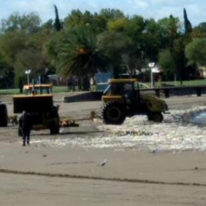 Personal municipal trabajaba por estas horas para limpiar la costa de los peces muertos y evitar las consecuencias derivadas del olor que podrían despedir, detalla Semanario Junín.