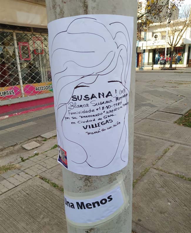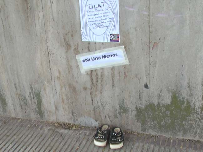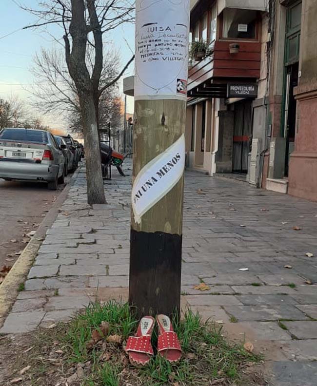 El colectivo que local que lucha contra los femicidios colocó en diferentes lugares de la planta urbana, en la ciudad cabecera, pares de zapatos con un cartel que recuerda a cada una de las 14 víctimas y sus victimarios de todo el distrito.