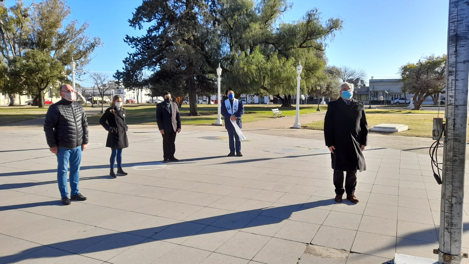 En el marco de la Emergencia Sanitaria por Coronavirus el Intendente Eduardo Campana izó la bandera nacional en la Plaza Principal junto al Presidente del Honorable Concejo Deliberante, Juan José Tomaselli, y los Presidentes de Bloques del Consejo Deliberante; Sol Fernández e Ignacio García Prieto.