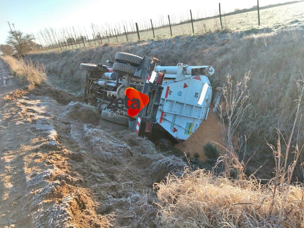 Un camión cargado con alimento balanceado, por razones no establecidas volcó sobre uno de los cunetones entre el acceso a Emilio V Bunge y el cementerio local. informó FM Zeta de esa localidad.