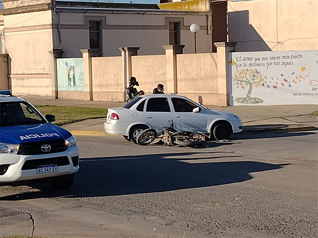 Por causas no establecidas la moto terminó debajo del Chevrolet Corsa justamente en la intersección de las calles Roca y Compagnucci, ingreso al sector de guardia del hospital.