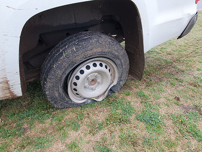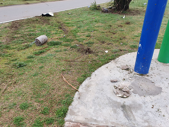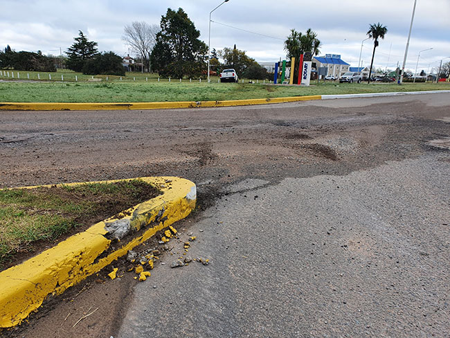Claramente se observaba que el vehículo que circulaba por la Ruta 188 en dirección desde la estación de servicio YPF hacia la ciudad, al intentar girar a su derecha para ingresar, había pasado de largo, impactando contra el primero de los canteros, y sin direccionar, seguido en esa dirección hacia el cantero central donde se encuentra el monolito del Rotary Club, al que le arrancó una de las columnas que lo forman.