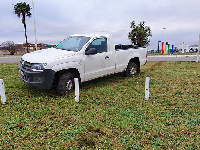 Al arribo de los efectivos hallaron a la pick un, una Volkswagen Amarok cabina simple, sobre uno de los laterales en el acceso Malvinas Argentinas, a metros de la ruta.