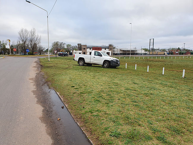 El vehículo a su vez continuó atravesando la mano que sale hacia la traza nacional, quedando parado contra los palos que divide la zona parquizada con el acceso con daños menores en su carrocería y las dos llantas izquierdas torcidas.