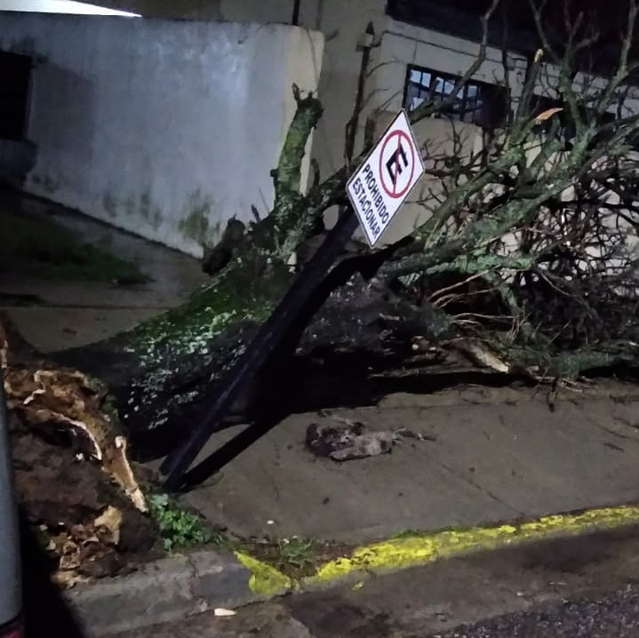 Como consecuencia de la caída del árbol un cartel indicativo de «prohibido estacionar» fue afectado.