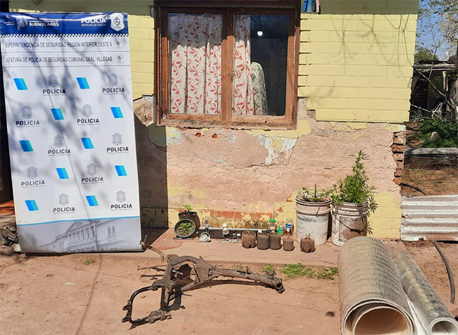 El procedimiento general fue llevado a cabo por personal de la Policía Comunal en conjunto con la DDI de Trenque Lauquen con asiento en Villegas arrojando resultado positivo en el segundo objetivo, donde se domicilia el imputado, identificado como Kevin Zabala, un cuadro de una moto 110 cc. que había sido denunciada por Luis Alberto Colman el pasado 26 de mayo; también se secuestró en la urgencia plantas de marihuana, frascos para almacenamiento, sistema de cultivo casero para las mismas y envoltorios para lo referido.