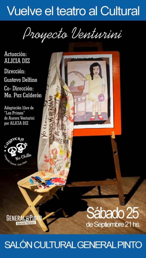 Las piezas son «Proyecto Venturini», el sábado a las 21:00 hs, donde actúa Alicia Diz con dirección de Gustavo Delfino y co-dirección de María Paz Delfino, sobre una adaptación libre de «Las Primas» de Aurora Venturini, que realizó la propia actriz pintense.