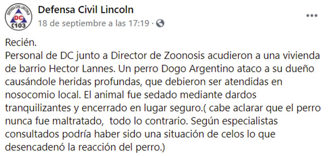 Fernando Sanz, titular de Defensa Civil Lincoln declaró que «no es un animal salvaje, era muy querido por la familia; criado desde cachorro; el perro siempre durmió adentro; aparentemente fue una cuestión de celos por las cuales atacó al dueño y lo lastimó mucho; lo agarró del cuello y si no fuese por la intervención de la mujer, lo mata, lo lastimó en las piernas y en los brazos; tuvimos que tirarle tres dardos tranquilizantes para poder sedar al animal». En la misma línea aclaró: “el animal fue trasladado a zoonosis donde lo estabilizaron y le limaron los colmillos”.