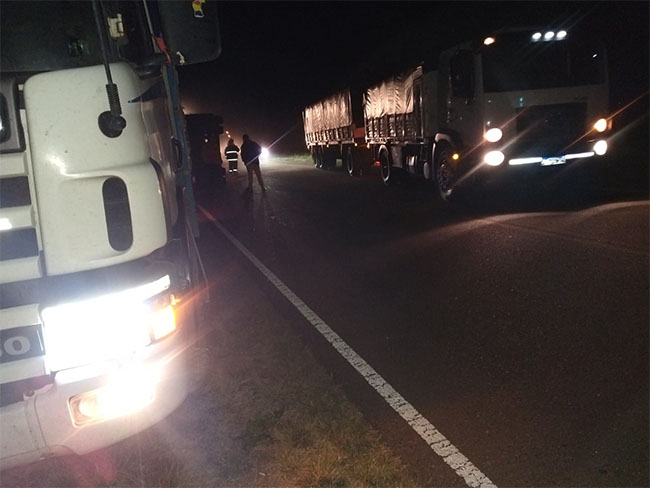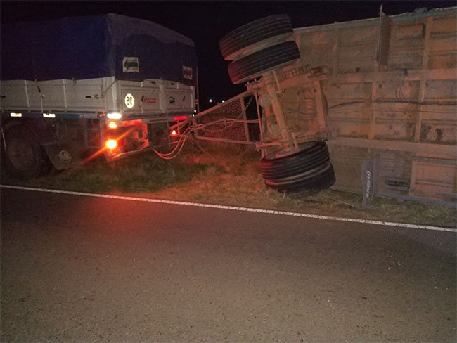 En la noche del martes un acoplado que era tirado por un camión Scania 260 proveniente de Las Acequias, Córdoba, derramó toda su carga sobre el asfalto luego de volcar en la primera curva en sentido Charlone Bunge, ubicada a escasos metros del acceso a la primera localidad, sitio en el que se han producido la mayoría de los últimos hechos de este tipo.