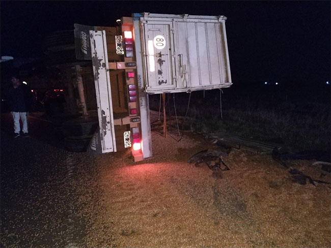 Por causas no establecidas se produjo el accidente que demandó la intervención por varias horas de los bomberos de Charlone, personal del Destacamento Policial que cortó la circulación del tránsito y el personal de la Delegación para ayudar a cargar parte del maíz luego de volver el acoplado a su posición normal y el resto barrerlo para despejar la ruta que estaba afectada en ambas manos y habilitar el tránsito.