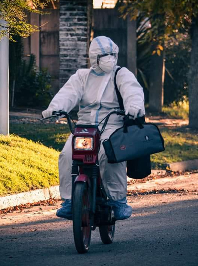 La verdadera obra es la acción que la llevó a la enfermera de la localidad de Banderaló Flavia Gallotti a que su imagen en plena pandemia diera la vuelta al mundo luego que fuera fotografiada cuando a bordo de su Juki 50 cc. visitara a los pacientes con Covid.