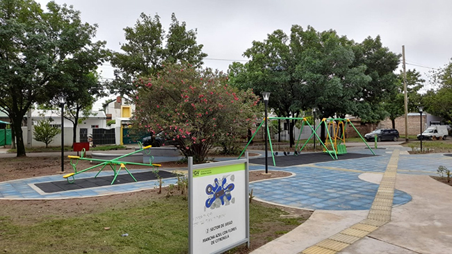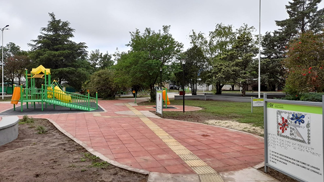Con respecto a las características de la plaza Norma Amilibia explicó que “surgió de una solicitud del Jardín N° 917 que está a pocos metros, para que sea adaptada a la discapacidad visual, entonces tomamos el compromiso e hicimos el proyecto que consiste en dos sectores bien diferenciados de juegos, de lugares de estar que están identificados con especies aromáticas, con una senda peatonal que va guiando a los distintos juegos y lugares y carteles que están en braille”.