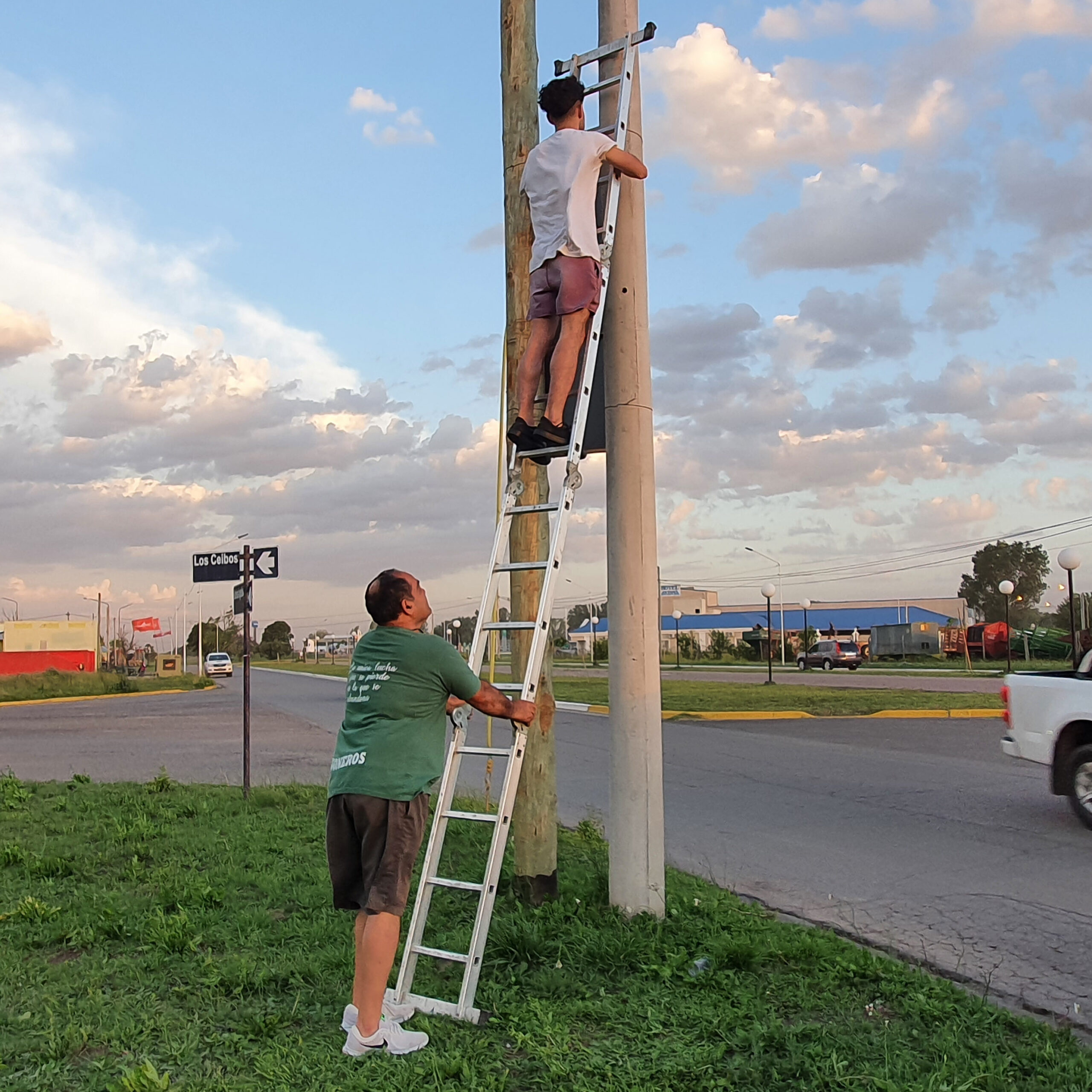 Al atardecer, momento en que tomamos las fotografías, el viento dificulta la tarea que se realizaba sin inconvenientes hasta que cambió el clima, de todos modos continuarán, aseguraron las dos personas que van descolgado los carteles.