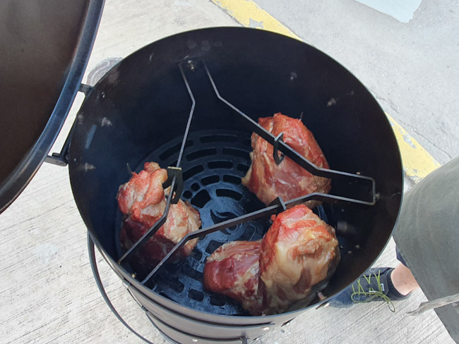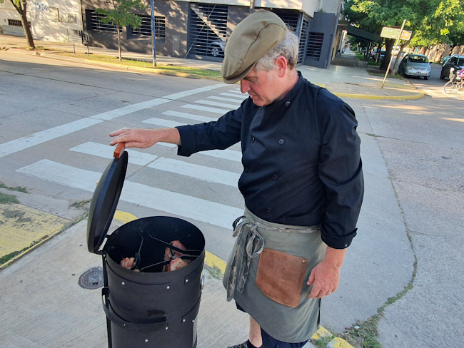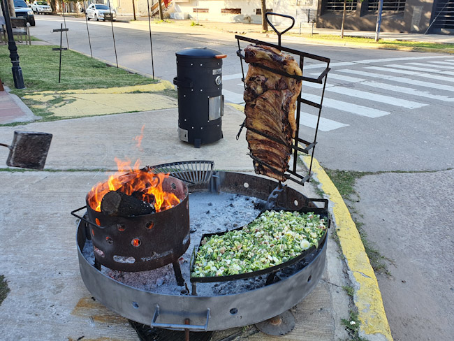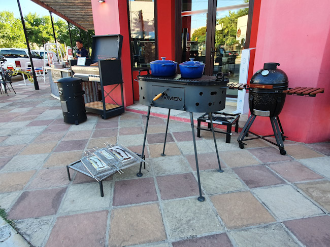 Carnes y verduras principalmente con diferentes condimentos (y el sello inconfundible de «El Colo») estas siendo asadas y cocidas en diferentes elementos distribuidos alrededor de la puerta principal del local comercial.