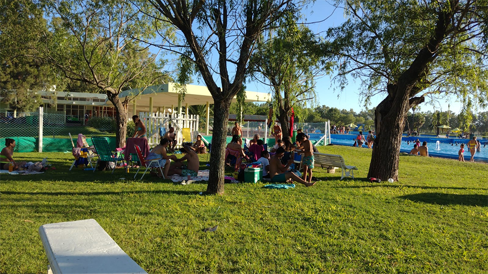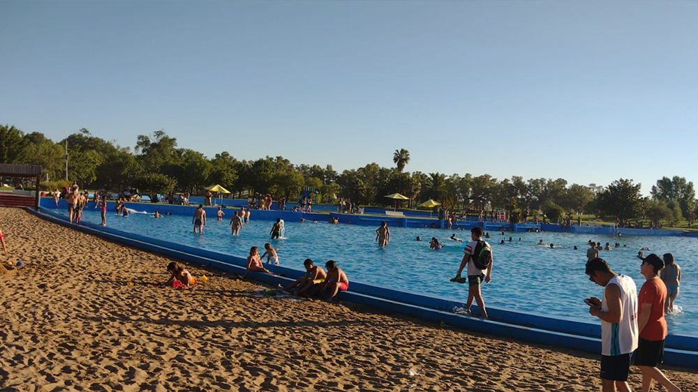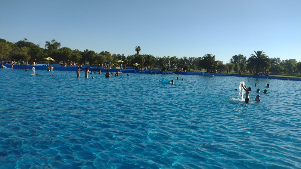 La pileta, enorme en su tamaño con su playa grande, su sector de césped con grandes árboles, sanitarios y cantina, todo funcionando y en marcha.