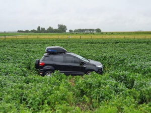 El conductor contó a Distrito Interior que al momento del hecho llovía intensamente, el auto, una Frod Eco Sport se desvió hacia la banquina sin que pudiera regrasarla a la ruta provocando al menos dos tumbos que los dejó dentro del préstamo sembrado con soja.