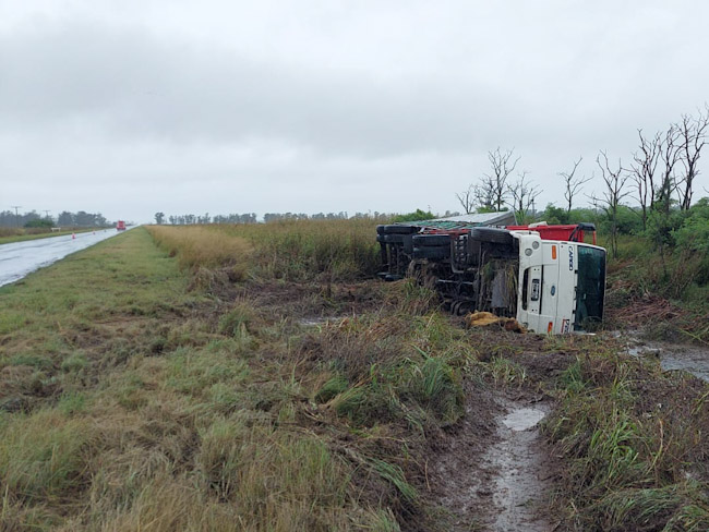 El camión de Transporte Rossi que era conducido por un villeguense se fue hacia la banquina para luego quedar volcado tal como se lo aprecia en la imagen.