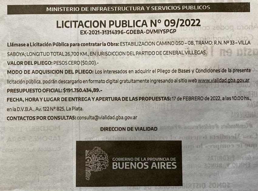 Sandra Solarino, vecina de la localidad del partido de General Villegas, publicó en sus redes una invitación para replicar la publicación que la Dirección de Vialidad de la provincia de Buenos Aires realizó en el marco de los pasos administrativos que se deben seguir en el proceso para llegar a la obra que establece la estabilización del camino que une la Ruta 33 con la localidad, de 26,700 kilómetros de largo, con un presupuesto oficial $191.750.434,89.